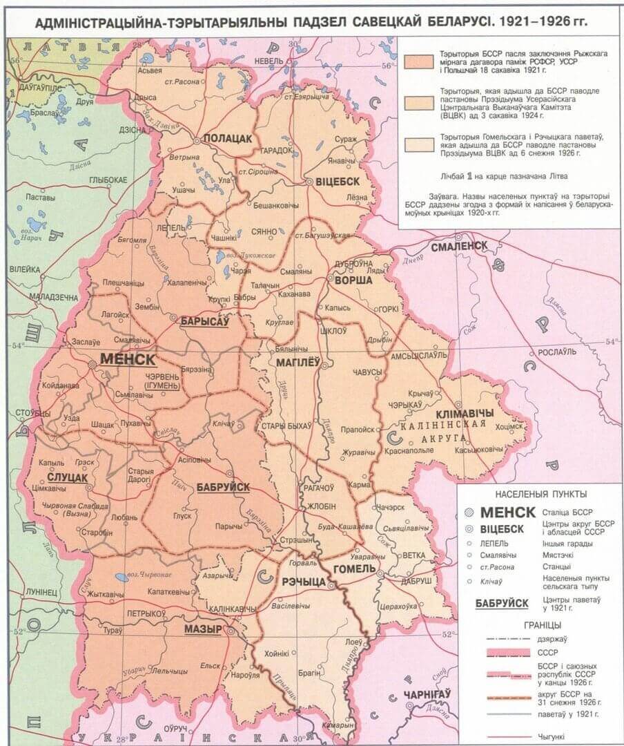 “Узбуйненні” БССР. Пытанне аб вяртанні забраных савецкай Расіяй беларускіх земляў было пастаўленае сакратаром Цэнтральнага бюро КП(б)Б В. Кнорыным яшчэ пры заключэнні польска-савецкага перамір’я ўвосень 1920 года. I з той пары яно ўвесь час было ў цэнтры ўвагі беларускіх бальшавікоў. У верасні 1922 г. партыйнае і савецкае кіраўніцтва БССР афіцыйна папрасіла ЦК РКП(б) вярнуць рэспубліцы Віцебскую, частку Смаленскай і ўтвораную ў 1919 г. Гомельскую (на месцы Магілёўскай) губерні, дзе пераважала беларускае насельніцтва. Масква аднак падазрона доўга ніяк не магла пераканаць у гэтым мясцовых кіраўнікоў беларускіх губерняў, далучаных да РСФСР. Беларускім камуністам давялося спісаць яшчэ шмат паперы, каб давесці Сталіну, што гутарка ідзе ўсяго толькі аб утварэнні ўзбуйненага адміністрацыйна-эканамічнага рэгіёна, які будзе мацаваць абароназдольнасць заходняй мяжы камуністычнай дзяржавы. Нарэшце 7 сакавіка 1924 г. УЦВК РСФСР прыняў пастанову аб “узбуйненні” БССР і перадачы ёй 15 паветаў: Віцебскага, Гарадоцкага, Дрысенскага, Лепельскага, Аршанскага, Полацкага, Сенненскага, Суражскага Віцебскай; Магілёўскага, Рагачоўскага, Быхаўскага, Клімавіцкага, Чэрыкаўскага, Чавускага Гомельскай і Горацкага Смаленскай губерняў.
